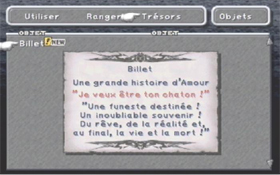 Vous pouvez à ce moment-là ouvrir le menu et notamment inspecter votre inventaire. Allez dans la section Trésors pour lire que qu'il y a d'inscrit sur votre Billet. Le titre de la pièce ne semble pas être correct... Avancez dans les rues de la ville jusqu'à la caisse (appuyez sur "Rond" pour courir ou bien modifiez l'option "déplacement" dans le menu de configuration). Vous pouvez poser quelques questions au caissier, notamment sur la reine Branet puis lorsque vous lui donnez votre billet, il s'aperçoit que c'est un faux. Le caissier vous console en vous donnant une carte Gobelin, une carte Meiden et une carte Squelette, 3 cartes de Tetra Master puis vous suggère de rencontrer Jack pour en savoir plus sur les cartes.