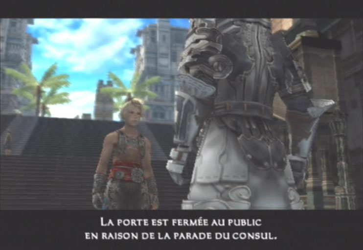Après la magnifique introduction du jeu, vous faîtes connaissance avec deux personnages. Reks, un jeune soldat de 17 ans, et Basch, un capitaine de l'armée de Dalmasca. Après un dialogue où vous faîtes également la connaissance de Vossler, vous prenez le contrôle de Reks et Basch vous explique les rudiments des contrôles du jeu. Commencez par bouger la caméra avec le stick analogique droit, puis approchez-vous de lui avec le stick analogique gauche. Allez ensuite parler à un garde en utilisant "Croix". Approchez-vous ensuite de la grille pour que Basch vous explique à quoi sert l'icône au-dessus de la tête de Reks. Ouvrez la grille en appuyant sur "Croix" pour pénétrer dans la forteresse de Nalbina.