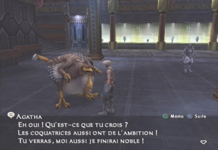 Il déambule au milieu des Chocobos à la rue des embruns de Port Balfonheim. Parlez tout d'abord à l'éleveuse de Chocobos, puis au Mog contrarié et enfin à Mandoline. Après une petite scène, vous gagnez une Lame gardienne
